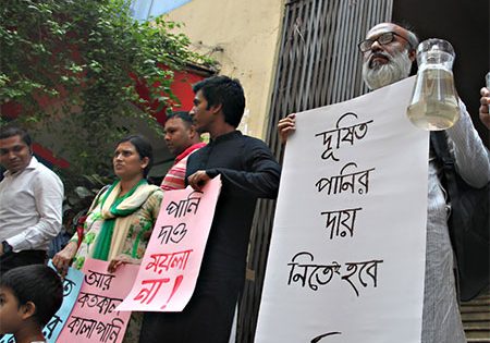 সকাল ১১টা। ওয়াসা ভবনের প্রবেশপথে প্ল্যাকার্ড হাতে দাঁড়িয়ে চার জন। তাতে লেখা ‘আর কতকাল কালা পানি খাওয়াবেন?’, ‘দূষিত পানির দায় নিতে হবে?’, ‘পানি দাও ময়লা না’। তাদের সঙ্গে জগ-বোতলে ওয়াসার পানি ও শরবত বানানোর সামগ্রী। প্রতিবাদকারীদের ওপর চোখ রাখতে ওয়াসা ভবনের প্রবেশপথে জনা বিশেক নিরাপত্তাকর্মী। ওয়াসা কর্মী ও সাধারণের প্রবেশে কড়াকড়ি না থাকলেও প্রতিবাদকারীদের প্রবেশে কড়াকড়ি আরোপ করেন নিরাপত্তা কর্মীরা। তারা ভেতরে প্রবেশ করে এমডির সঙ্গে সাক্ষাতের চেষ্টা করলে নিরাপত্তা কর্মীরা জানান ওয়াসার ব্যবস্থাপনা পরিচালক তার কার্যালয়ে নেই। এতে ক্ষুব্ধ হয়ে প্রতিবাদকারীরা প্রবেশ পথে বসে পড়েন। তারা নিরাপত্তা কর্মী ও উপস্থিত গণমাধ্যমকে জানান এমডির সাক্ষাৎ না পেলে তারা এখান থেকে সরবেন না। এক পর্যায়ে তাদের ভেতরে প্রবেশ করতে দেয়া হয়। তাদের নিয়ে যাওয়া হয় পরিচালক (টেকনিক্যাল) এ কে এম সহিদ উদ্দিন এর কক্ষে।