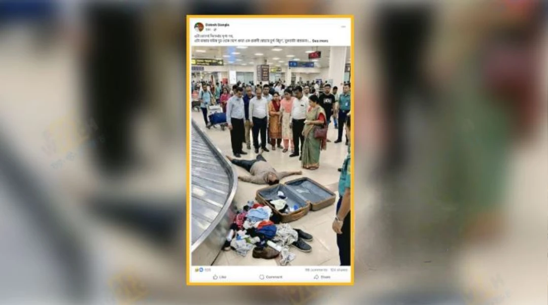 ঢাকার হযরত শাহজালাল আন্তর্জাতিক বিমানবন্দরে বিদেশ ফেরত একজন যাত্রীর অবস্থা দাবিতে ফেসবুকে একটি ছবি প্রচার করা হচ্ছে। ছবিতে দেখা যাচ্ছে, একজন ব্যক্তি বিমানবন্দর সদৃশ একটি স্থানে মেঝেতে হাত-পা ছড়িয়ে শুয়ে আছেন। পুলিশসহ কিছু মানুষ তাকে ঘিরে দাঁড়িয়ে আছেন। ছবিটি নিয়ে ফ্যাক্টওয়াচের যাচাইয়ে দেখা যায়, এটি বাস্তব নয়, এআই জেনারেটেড ছবি।