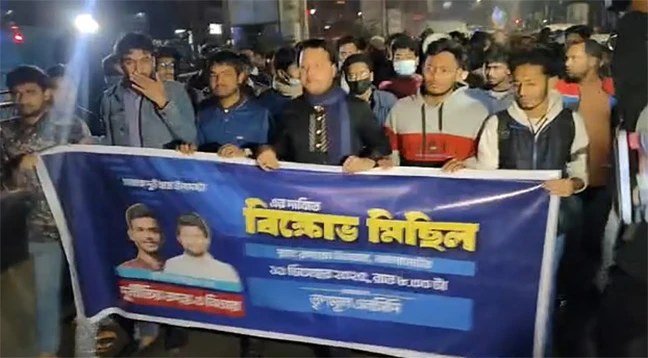 বৃহস্পতিবার রাত নয়টার দিকে রাজধানীর বাংলামোটরে এই বিক্ষোভ হয়। মিছিলের ব্যানারে আয়োজক হিসেবে লেখা ছিল ‘তৃণমূল এনসিপি’। এর আগে বিকেলে এক ফেসবুক পোস্টে ‘তৃণমূল এনসিপি’ গঠনের ঘোষণা দেন মুনতাসির মাহমুদ।
