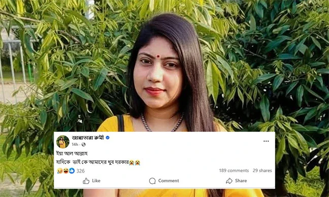 রুমীসামাজিক যোগাযোগ মাধ্যম ফেসবুকে নিজের ভেরিফায়েড আইডি থেকে দেওয়া সর্বশেষ স্ট্যাটাসে তিনি ওসমান হাদির কথা উল্লেখ করেন। ওই স্ট্যাটাসে তিনি লেখেন, ‘ইয়া আল আল্লাহ, হাদিকে ভাইকে আমাদের খুব দরকার।