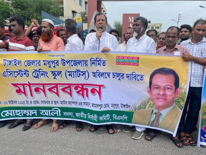 সোমবার দুপুরে মধুপুর উপজেলার কাইতকাই এলাকায় ম্যাটসের সামনে মধুপুরবাসীর পক্ষে অ্যাডভোকেট মোহাম্মদ আলী এই মানববন্ধনের আয়োজন করেন। চার বছর আগে নির্মিত এই প্রতিষ্ঠান চালুর দাবিতে অনুষ্ঠিত মানববন্ধনে বিভিন্ন শ্রেণিপেশার কয়েকশত লোক অংশ নেন।
