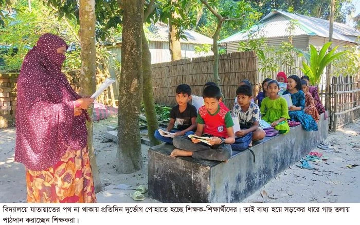 কুড়িগ্রাম প্রতিনিধিঃ কুড়িগ্রাম জেলার চিলমারী উপজেলার পাত্রখাতা গ্রামের পূর্ব চর পাত্রখাতা সরকারি প্রাথমিক বিদ্যালয়ে যাওয়ার একমাত্র রাস্তাটি বন্ধ হয়ে গেছে বন্দোবস্ত পাওয়া সরকারি জমিতে স্থাপনা নির্মাণের কারণে। পাঁচ বছর ধরে চলা এ ভোগান্তির কোনো সমাধান না পেয়ে শিক্ষকরা বাধ্য হয়ে সড়কের ধারে গাছতলায় পাঠদান শুরু করেছেন।