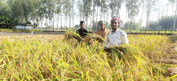 ডোমারে আমনে’র বাম্পার ফলন; মনের আনন্দে ধান তুলতে মাঠে কৃষাণ কৃষাণী