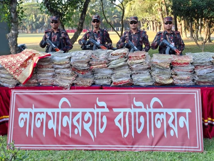 জিন্নাতুল ইসলাম জিন্না, লালমনিরহাট প্রতিনিধি: সীমান্তে চোরাচালানবিরোধী অভিযানে একটি বিশাল সাফল্য অর্জন করেছে লালমনিরহাট ব্যাটালিয়ন (১৫ বিজিবি)। কুড়িগ্রামের ভুরুঙ্গামারী সীমান্ত এলাকা থেকে বিপুল পরিমাণ অবৈধ ভারতীয় স্বর্ণ কাতান শাড়ির চালান জব্দ করা হয়েছে। জব্দকৃত শাড়ির সিজার মূল্য ২৭ লক্ষ ২০ হাজার টাকা।