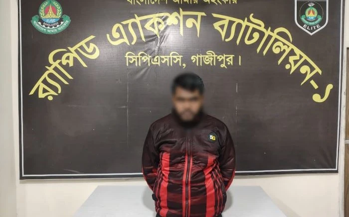 রোববার (২৮ ডিসেম্বর) বিকেলে গাজীপুরের কাশিমপুর থানার মোহাম্মদী নগর লতিফপুর এলাকা থেকে রুবেল ইসলাম (২৯)কে গ্রেপ্তার করা হয়। সোমবার (২৯ ডিসেম্বর) সকালে এক সংবাদ বিজ্ঞপ্তিতে বিষয়টি নিশ্চিত করে র্যাব-৫। গ্রেপ্তারকৃত রুবেল রাজশাহীর গোদাগাড়ী উপজেলার দেওপাড়া ইউনিয়নের চকপাড়া গ্রামের ওয়াজেদ আলীর ছেলে।