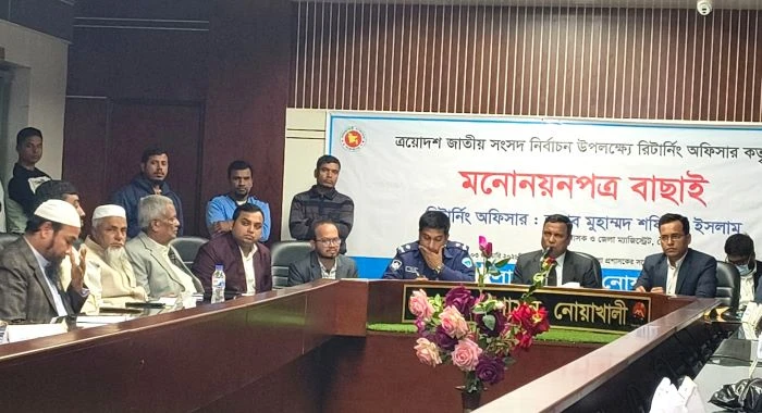 নোয়াখালী-৪: বাংলাদেশ জাতীয়তাবাদী দল (বিএনপি) ভাইস চেয়ারম্যান আলহাজ্ব মো. শাহজাহান, নোয়াখালী জেলা জামায়াতে ইসলামীর আমীর ইসহাক খন্দকার, ইনসানিয়াত বিপ্লব বাংলাদেশের প্রার্থী ইউনুস নবী, জাতীয় পার্টির মো. শরিফুল ইসলাম, ইসলামী আন্দোলন বাংলাদেশের ফিরোজ আলম মাসুদ, বাংলাদেশ সমাজতান্ত্রিক দল (মার্কসবাদী)র বিটুল চন্দ্র তালুকদার, গণ-অধিকার পরিষদের আবদুজ জাহেরকে বৈধ প্রার্থী হিসেবে ঘোষণা করেন রির্টানিং কর্মকর্তা। স্বতন্ত্র প্রার্থী মো. ইশতিয়াক হোসেনের মনোনয়নপত্র বাতিল ঘোষণা করা হয়। ৮জন প্রার্থীর মধ্যে ৭জনকে বৈধ এবং ১জন স্বতন্ত্র প্রার্থীর মনোনয়ন বাতিল ঘোষনা করেছেন রিটার্নিং কর্মকর্তা৷