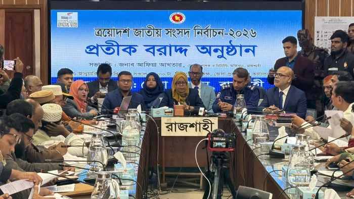 বুধবার (২১ জানুয়ারি) সকাল ১০টা থেকে রাজশাহী জেলা প্রশাসকের কার্যালয়ে জেলা রিটার্নিং কর্মকর্তা ও জেলা প্রশাসক আফিয়া আখতারের উপস্থিতিতে প্রতীক বরাদ্দ কার্যক্রম শুরু হয়। এ সময় সহকারী রিটার্নিং কর্মকর্তা, আইনশৃঙ্খলা বাহিনীর সদস্য, প্রার্থী ও তাদের প্রতিনিধিরা উপস্থিত ছিলেন। সুষ্ঠু ও শান্তিপূর্ণ পরিবেশে পুরো কার্যক্রম সম্পন্ন হয়।