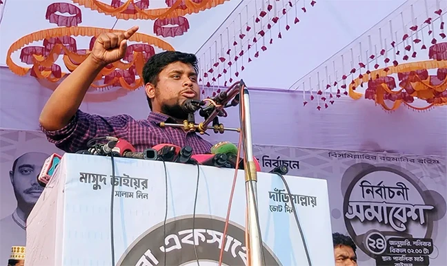 হাসনাত আব্দুল্লাহ বলেন, আমরা দেখছি হুমকি ধমকি দেওয়া হচ্ছে, কেন্দ্র দখলের পায়তার চলছে। এই তরুণ প্রজন্ম কী বসে থাকবে? আমরা, এই তরুণ প্রজন্ম হাসিনাকে ভয় পায়নি। দুই পয়সার দাম দেয়নি। কেউ যদি মনে করে অপার সম্ভাবনার এই তরুণ প্রজন্মকে আবার কামান, পুলিশ ও মিলিটারি দিয়ে গুলি করে পেট্রল দিয়ে দমন করা হবে তাহলে তারা ইতিহাসের ভুল প্রান্তে অবস্থান করছে। আগামী ১২ ফেব্রুয়ারি নির্বাচনে উপস্থিত জনতাকে ভোট কেন্দ্রে গিয়ে ফজর নামাজ পড়তে বলেন তিনি।