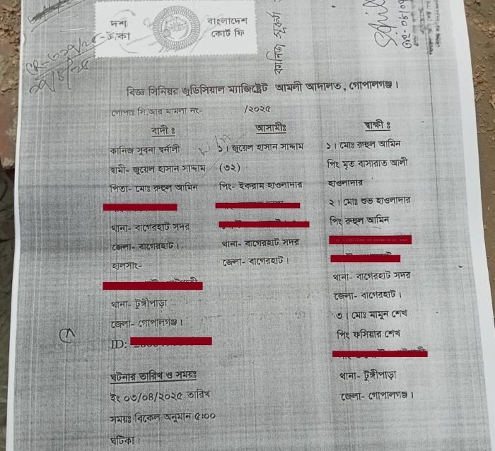 জুলাইয়ের ৮ তারিখে দায়ের করা মামলার এজহারে উল্লেখ রয়েছে, “যেহেতু বিবাহের কিছুদিন পর হইতেই যৌতুক লোভী আসামী ব্যবসার কথা বলে বাদীনির পিতার নিকট থেকে ২,০০,০০০/-(দুই লক্ষ) টাকা যৌতুক আনার জন্য চাপ প্রয়োগ করিতে থাকে এবং বিভিন্ন সময়ে শারীরিক ও মানসিক নির্যাতন করিতে থাকে। বাদীনির পিতা কন্যার সুখের কথা চিন্তা করিয়া বিগত দিনের বিভিন্ন তারিখ ও সময়ে ১ নং আসামীকে ব্যাবসার জন্য মোট ১,০০,০০০/- (এক লক্ষ) টাকা প্রদান করেন। আসামী নেশায় আসক্ত হওয়ায় উক্ত টাকা খরচ করিয়া পুনরায় বাদীনির পিতার নিকট থেকে ২,০০,০০০/-(দুই লক্ষ) টাকা যৌতুক আনার জন্য চাপ প্রয়োগ করিলে বাদিনী পিতার নিকট থেকে আর কোন টাকা চাহিতে অস্বীকার করায় গত ০৩/০৪/২০২৫ ইং তারিখ আসামী বাদিনীকে এক কাপড়ে ভাড়া বাসা থেকে বের করে এবং যৌতুকের টাকা নিয়ে না আসলে বাদীনির সাথে সংসার করিবে না মর্মে জানায়।“