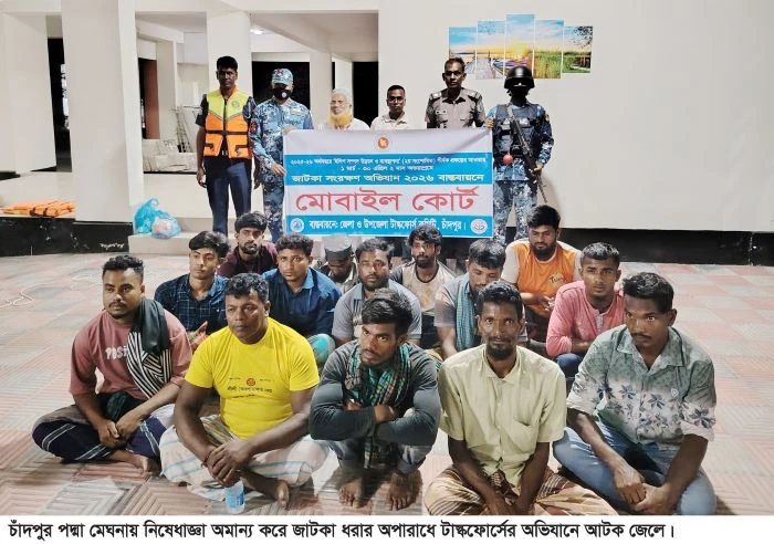 মিজান লিটন : চাঁদপুরের পদ্মা-মেঘনার অভয়াশ্রম এলাকায় নিষেধাজ্ঞা অমান্য করে জাটকা ধরার অপরাধে ১৭ জেলেকে আটক করা হয়েছে। এর মধ্যে ১৪ জনকে বিভিন্ন মেয়াদে কারাদন্ড দিয়েছে ভ্রাম্যমাণ আদালত। বাকী ৪ জন অপ্রাপ্ত বয়স্ক হওয়ায় মুচলেকা রেখে ছেড়ে দেয়া হয়।