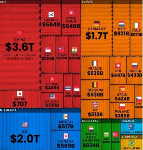 বিশ্ববাজারে রপ্তানিতে চীনের প্রভাব ক্রমেই বাড়ছে। আমেরিকার বাইরে চীনের পণ্য কেনার হার এখন আগের চেয়ে অনেক বেশি। ২০২৪ সালে চীনের রপ্তানি ৬ শতাংশ বেড়ে ৩.৬ ট্রিলিয়ন ডলারে পৌঁছেছে, যা যুক্তরাষ্ট্রের চেয়ে তার ব্যবধান আরও বাড়িয়েছে। বিশ্ব রপ্তানির প্রায় ৩৬ শতাংশ কনটেইনারে চীনের পণ্য রয়েছে। ২০২৫ সালে লাতিন আমেরিকা, আফ্রিকা ও এশিয়ায় চীনের রেকর্ড শিপমেন্টের সম্ভাবনা রয়েছে।