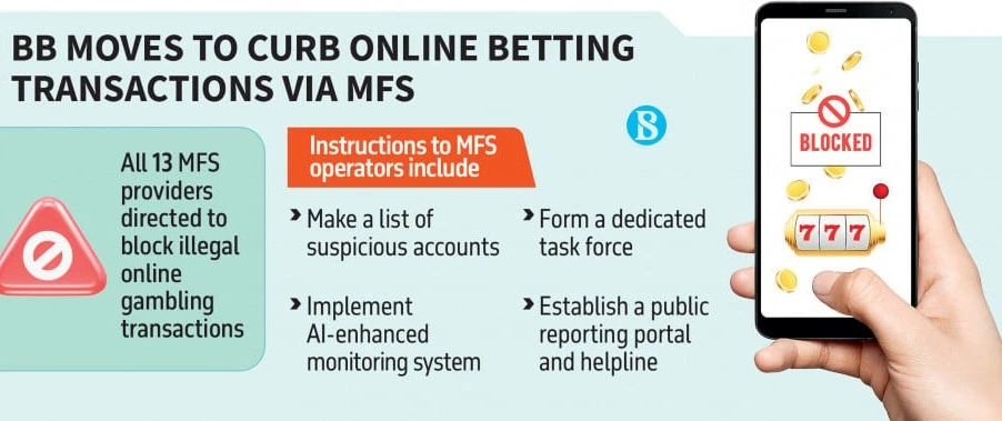 মোবাইল ফিন্যান্সিয়াল সার্ভিস (এমএফএস) প্ল্যাটফর্মের মাধ্যমে অবৈধ অনলাইন জুয়ার লেনদেন প্রতিরোধে সব এমএফএস প্রতিষ্ঠানকে জরুরি ভিত্তিতে পদক্ষেপ নিতে নির্দেশ দিয়েছে বাংলাদেশ ব্যাংক। তবে এমএফএস অপারেটররা বলছে, এসব লেনদেনের ধরন শনাক্ত করা প্রায় অসম্ভব।