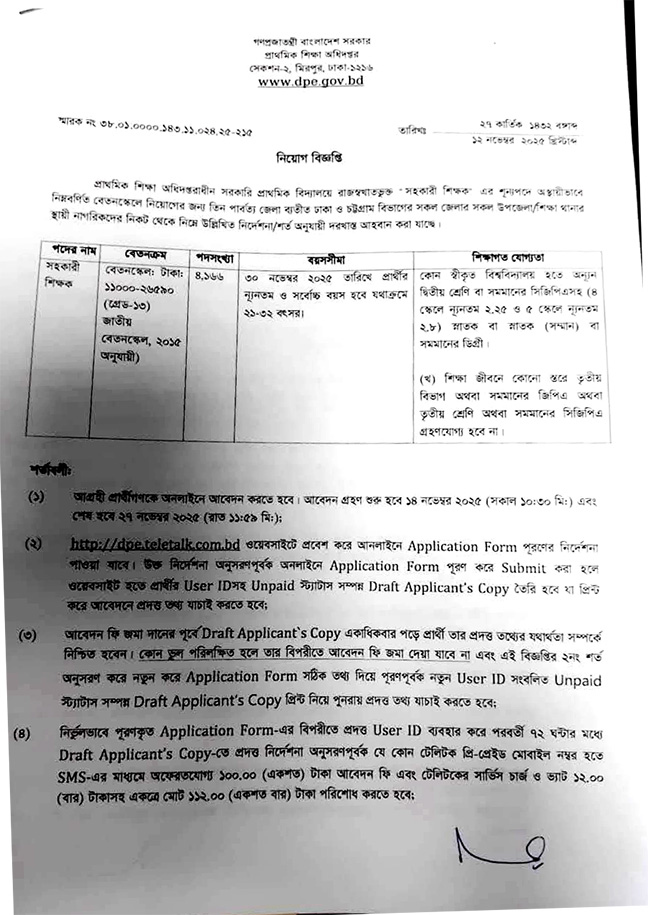 সরকারি প্রাথমিক বিদ্যালয়ে সহকারী শিক্ষক পদে ৪ হাজার ১৬৬ জন নিয়োগের জন্য বিজ্ঞপ্তি আজ বুধবার (১২ নভেম্বর) প্রকাশ করা হয়েছে।