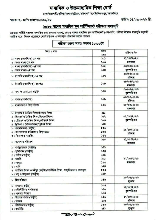 ২০২৬ সালের মাধ্যমিক স্কুল সার্টিফিকেট (এসএসসি) পরীক্ষার সময়সূচি প্রকাশ করেছে মাধ্যমিক ও উচ্চমাধ্যমিক শিক্ষা বোর্ড। প্রকাশিত রুটিন অনুযায়ী আগামী ২১ এপ্রিল থেকে শুরু হবে এসএসসি পরীক্ষা। পরীক্ষা চলবে প্রতিদিন সকাল ১০টা থেকে।