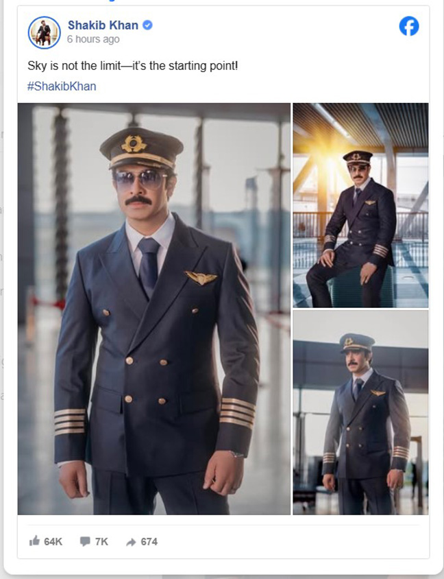 শনিবার (২৯ নভেম্বর) দুপুরে নিজের ভেরিফাইড ফেসবুকে একটি স্ট্যাটাস দেন শাকিব। তিনটি ছবি আপলোড করেন। ছবিগুলোতে পাইলটের পোশাক পরা শাকিব।