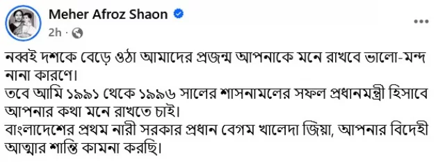 স্ট্যাটাসে মেহের আফরোজ শাওন লেখেন, ‘নব্বই দশকে বেড়ে হওয়া আমাদের প্রজন্ম আপনাকে মনে রাখবে ভালো-মন্দ নানা কারণে। তবে আমি ১৯৯১ থেকে ১৯৯৬ সালের শাসনামলে সফল প্রধানমন্ত্রী হিসেবে আপনার কথা মনে রাখতে চাই।’