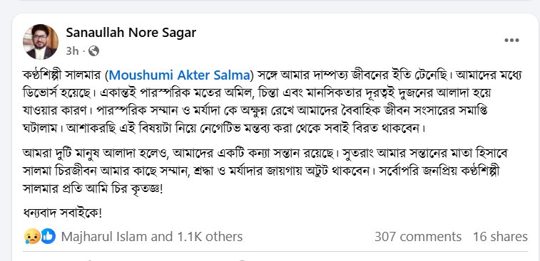 ফেসবুক পোস্টে সানাউল্লাহ নূর লেখেন, কণ্ঠশিল্পী সালমার সঙ্গে আমার দাম্পত্য জীবনের ইতি টেনেছি। আমাদের মধ্যে ডিভোর্স হয়েছে। একান্তই পারস্পরিক মতের অমিল, চিন্তা এবং মানসিকতার দূরত্বই দুজনের আলাদা হয়ে যাওয়ার কারণ। পারস্পরিক সম্মান ও মর্যাদা অক্ষুণ্ন রেখেই এই বিচ্ছেদ সম্পন্ন হয়েছে এবং বিষয়টি নিয়ে নেতিবাচক মন্তব্য করা থেকে সবাইকে বিরত থাকবেন।