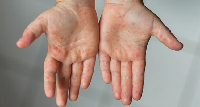 কাছাকাছি প্রাথমিক লক্ষণ দেখা দেয়ার ৩ থেকে ৪ দিন পরে, দ্য লালচে-বাদামী ত্বকের ফুসকুড়ি দেখা দেয়। এটি সাধারণত: