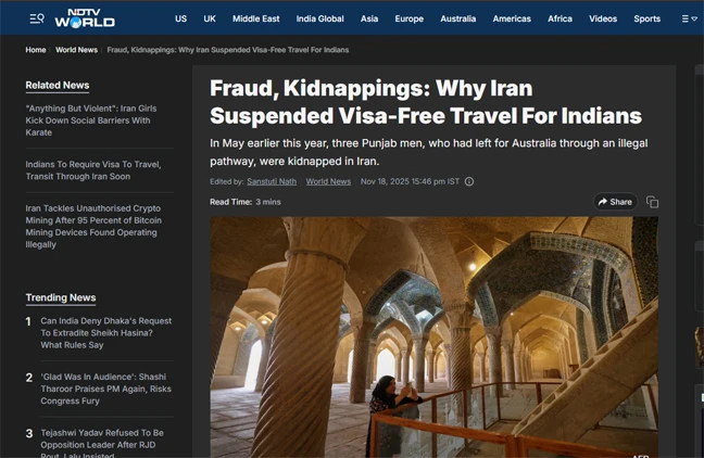 ইরান ভারতীয় নাগরিকদের জন্য ভিসামুক্ত প্রবেশ বন্ধ করে দিয়েছে। ভুয়া চাকরির লোভ দেখিয়ে মানব পাচার ও মুক্তিপণ আদায়ের ঘটনা বেড়ে যাওয়ায় দেশটি এই সিদ্ধান্ত নিয়েছে।