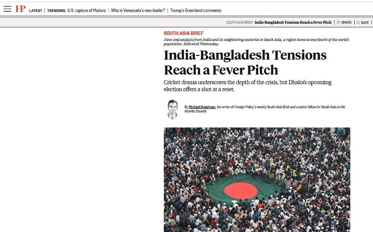 বিএনপি চেয়ারপারসন ও সাবেক প্রধানমন্ত্রী খালেদা জিয়ার মৃত্যুতে ভারতের প্রধানমন্ত্রী নরেন্দ্র মোদির শোক ও ঢাকায় তার জানাজায় দেশটির বিদেশমন্ত্রী এস জয়শঙ্করের উপস্থিতির মাধ্যমে বিএনপি-নেতৃত্বাধীন সম্ভাব্য সরকারের প্রতি ভারত নতুন ধরনের বার্তা দিচ্ছে। ফরেন পলিসি ম্যাগাজিনে ‘ভারত-বাংলাদেশ উত্তেজনা চরমে’ শীর্ষক প্রতিবেদনে ‘ভারত ও বাংলাদেশ কি সম্পর্ক পুনর্গঠন করতে পারবে?’- উপশিরোনামে এক বিশ্লেষণী প্রতিবেদনে এসব কথা লিখেছেন আটলান্টিক কাউন্সিলের দক্ষিণ এশিয়া বিষয়ক সিনিয়র ফেলো মাইকেল কুগেলম্যান।