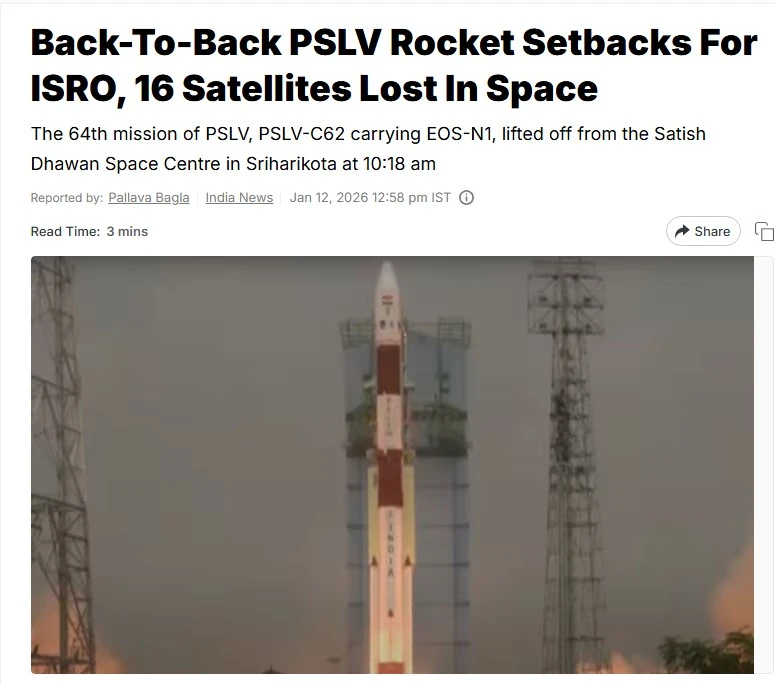 পিএসএলভি-সি৬২-কে লঞ্চ ভেহিকলটির ‘কামব্যাক’ হিসেবে দেখা হচ্ছিল। ২০২৫ সালে পিএসএলভির মাধ্যমে মাত্র একটি রকেট উৎক্ষেপণ করা হয়েছিল, সেটিও ব্যর্থতায় পর্যবসিত হয়। সেই ব্যর্থতাও রকেটের তৃতীয় ধাপেই ঘটেছিল বলে সে সময় জানিয়েছিল ইসরো।