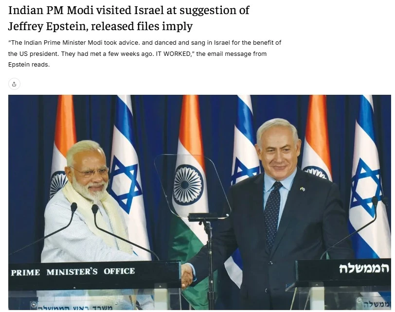 ইসরায়েলি সংবাদমাধ্যম জেরুজালেম পোস্ট বলছে, ২০১৭ সালে ইসরায়েল সফরের আয়োজন নিয়ে ভারতের প্রধানমন্ত্রী নরেন্দ্র মোদি যৌন অপরাধে দণ্ডিত জেফ্রি এপস্টেইনের পরামর্শ নিয়েছিলেন বলে দাবি করেছে ভারতীয় গণমাধ্যম। শনিবার প্রকাশিত ‘এপস্টেইন ফাইলস’-এর অংশ হিসেবে সামনে আসা একটি ই-মেইলের বরাতে এ তথ্য জানানো হয়।