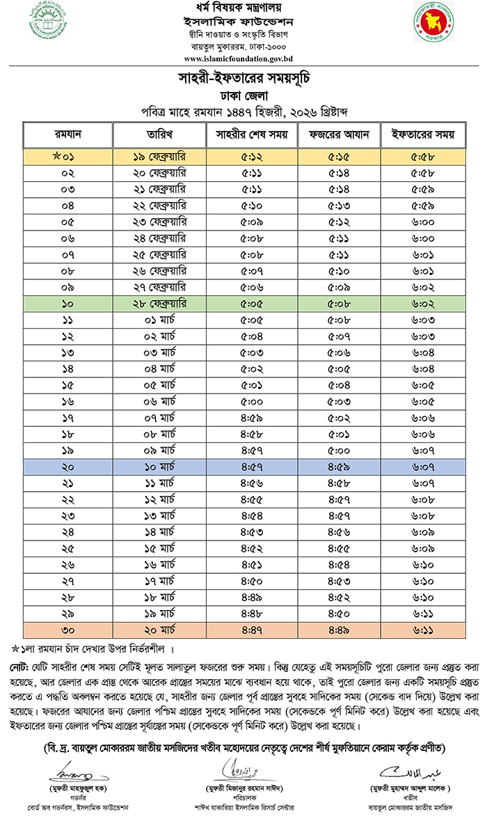 ঢাকার সময় অনুসারে ১৯ ফেব্রুয়ারি বৃহস্পতিবার প্রথম রোজার সেহরির শেষ সময় ভোর ৫টা ১২ মিনিট এবং ইফতারের সময় সন্ধ্যা ৫টা ৫৮ মিনিট।