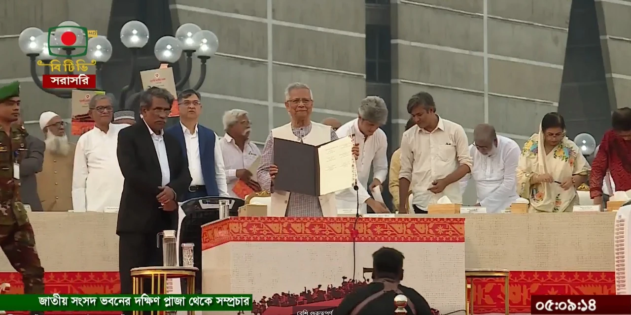 জাতীয় ঐকমত্যের বহু প্রতীক্ষিত ‘জুলাই সনদ’ স্বাক্ষর করলেন অন্তর্বর্তী সরকারের প্রধান উপদেষ্টা ও রাজনৈতিক দলের নেতারা। আজ শুক্রবার বিকেল ৫টার দিকে এ স্বাক্ষর অনুষ্ঠিত হয়।