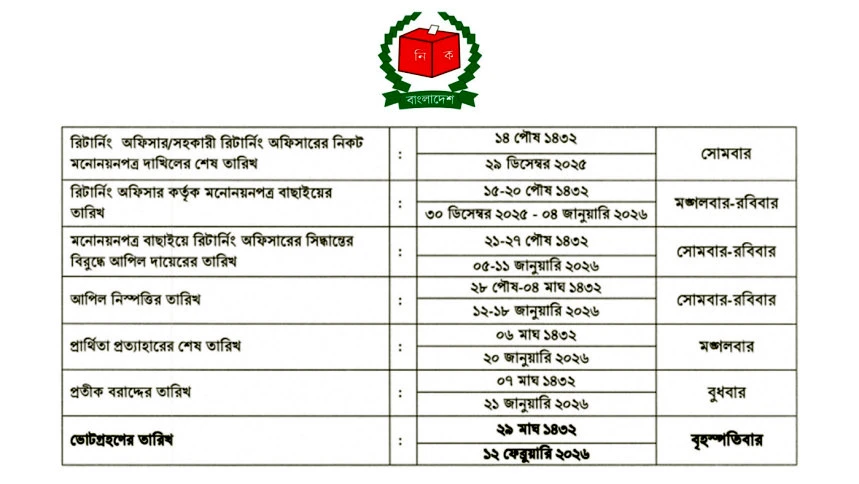 মনোনয়নপত্র বাছাইয়ে রিটার্নিং অফিসারের সিদ্ধান্তের বিরুদ্ধে আপিল দাখিলের তারিখ ৫ থেকে ১১ জানুয়ারি।