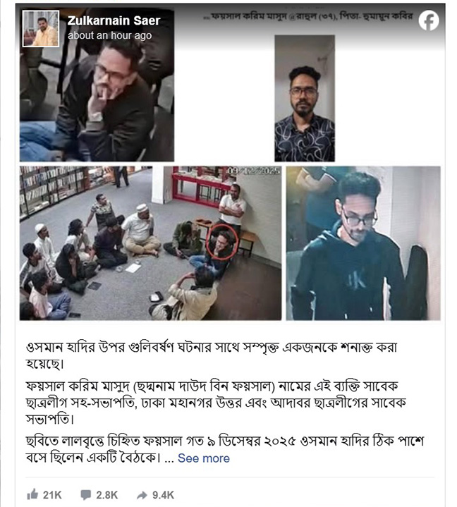 ফেসবুক পোস্টে জুলকারনাইন সায়ের লিখেন, “ওসমান হাদির উপর গুলিবর্ষণ ঘটনার সাথে সম্পৃক্ত একজনকে শনাক্ত করা হয়েছে। ফয়সাল করিম মাসুদ (ছদ্মনাম দাউদ বিন ফয়সাল) নামের এই ব্যক্তি সাবেক ছাত্রলীগ সহ-সভাপতি, ঢাকা মহানগর উত্তর এবং আদাবর ছাত্রলীগের সাবেক সভাপতি।