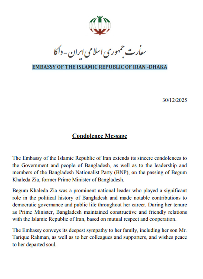 বাংলাদেশের সাবেক প্রধানমন্ত্রী ও বিএনপি চেয়ারপারসন বেগম খালেদা জিয়ার মৃত্যুতে গভীর শোক প্রকাশ করেছে ইরান। মঙ্গলবার (৩০ ডিসেম্বর) এক শোকবার্তায় বাংলাদেশের সরকার ও জনগণের পাশাপাশি বাংলাদেশ জাতীয়তাবাদী দলের (বিএনপি) নেতৃত্ব ও নেতাকর্মীদের প্রতি আন্তরিক সমবেদনা জানায় ঢাকায় নিযুক্ত ইরানের দূতাবাস।