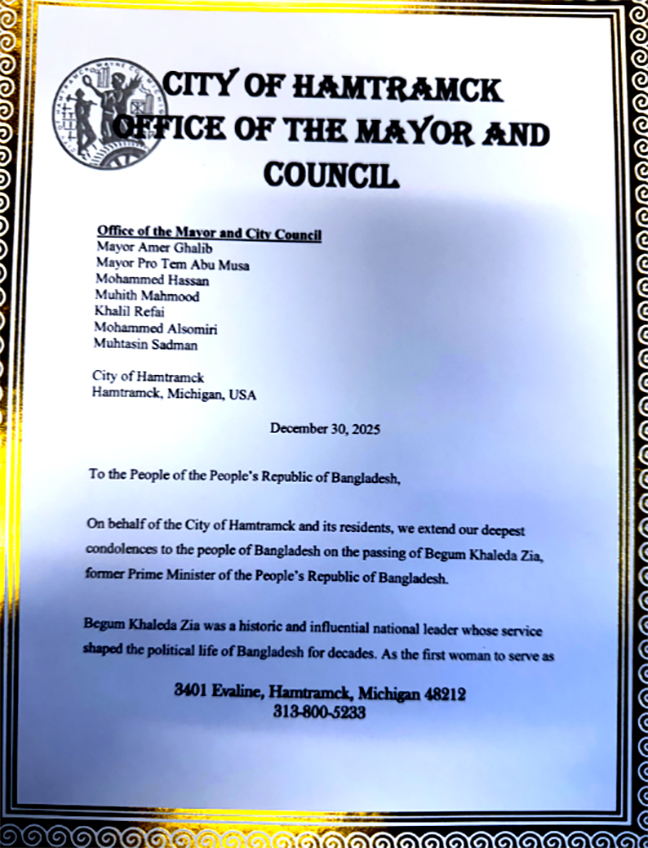 যুক্তরাষ্ট্রের মিশিগান অঙ্গরাজ্যে বাংলাদেশের তিনবারের সাবেক প্রধানমন্ত্রী ও বিএনপি চেয়ারপারসন বেগম খালেদা জিয়ার নামে একটি রাস্তার নামকরণ করা হয়েছে। হ্যামট্রমিক শহরের প্রাণকেন্দ্রে অবস্থিত গুরুত্বপূর্ণ ‘কারপেন্টার স্ট্রিট’ এখন থেকে তার নামেই পরিচিত হবে। শহর কর্তৃপক্ষের এই সিদ্ধান্তকে বাংলাদেশের ইতিহাস, নেতৃত্ব এবং গণতন্ত্রের প্রতি এক অনন্য স্বীকৃতি হিসেবে দেখছেন প্রবাসী বাংলাদেশিরা।