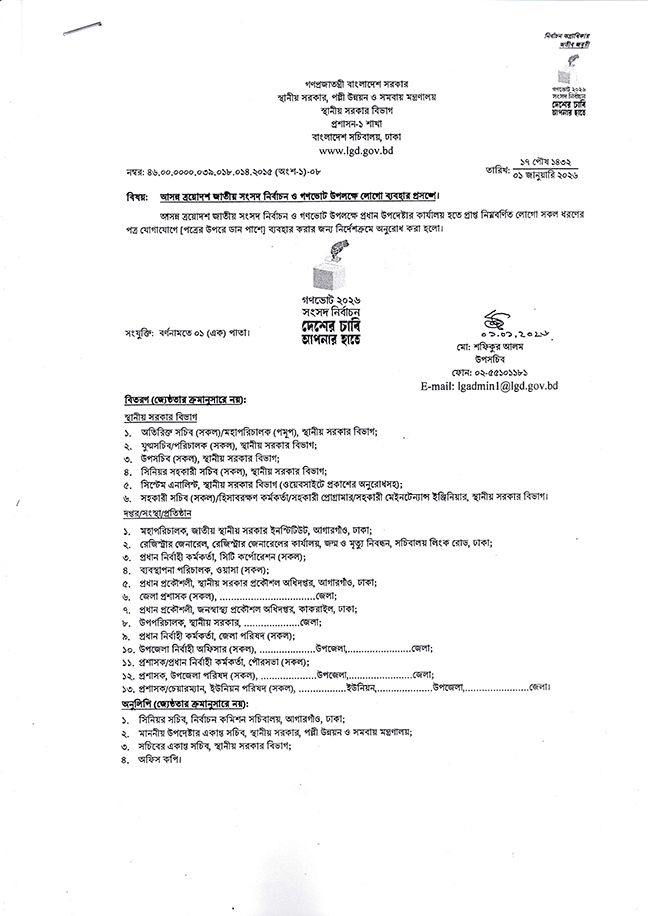 মন্ত্রিপরিষদ বিভাগের চিঠিতে জানানো হয়েছে, নির্বাচনের দিনেই 'জুলাই জাতীয় সনদ ২০২৫'-এ লিপিবদ্ধ সংবিধান সংস্কার প্রস্তাবগুলোর ওপর গণভোট অনুষ্ঠিত হবে। এই গুরুত্বপূর্ণ বিষয়ে ভোটারদের মধ্যে সচেতনতা তৈরি করতে সব ধরণের পত্র, প্রজ্ঞাপন, আদেশ ও পরিপত্রে লোগো ব্যবহার বাধ্যতামূলক করা হয়েছে।