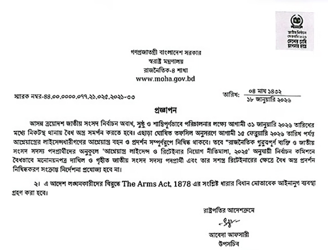 স্বরাষ্ট্র মন্ত্রণালয়ের প্রজ্ঞাপনে বলা হয়, ঘোষিত তফসিল অনুসরণে আগামী ১৫ ফেব্রুয়ারি পর্যন্ত আগ্নেয়াস্ত্রের লাইসেন্সধারীদের আগ্নেয়াস্ত্র বহন-প্রদর্শন সম্পূর্ণভাবে নিষিদ্ধ থাকবে।