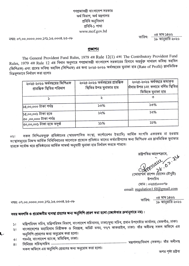 সরকারি কর্মচারীদের সাধারণ ভবিষ্য তহবিল (জিপিএফ) এবং প্রদেয় ভবিষ্য তহবিলে (সিপিএফ) টাকা রাখার বিপরীতে সুদের হার নির্ধারণ করা হয়েছে। এতে দেখা গেছে আগের সুদের হারই বহাল রাখা হয়েছে। এ হার ১১ থেকে ১৩ শতাংশ।