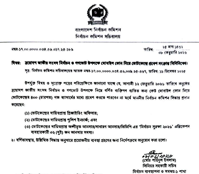 নির্দেশনায় বলা হয়, আগামী ১২ ফেব্রুয়ারি অনুষ্ঠিতব্য জাতীয় সংসদ নির্বাচন ও গণভোট উপলক্ষে ভোটকেন্দ্রের ৪০০ গজ ব্যাসার্ধের মধ্যে সাধারণভাবে কেউ মোবাইলফোন নিয়ে প্রবেশ করতে পারবেন না। তবে ভোটকেন্দ্রের দায়িত্বপ্রাপ্ত প্রিসাইডিং অফিসার, ভোটকেন্দ্রের দায়িত্বপ্রাপ্ত পুলিশ ইনচার্জ এবং ‘নির্বাচন সুরক্ষা ২০২৬’ অ্যাপ্লিকেশন ব্যবহারকারী অঙ্গীভূত আনসার, সাধারণ আনসার ও ভিডিপির দুজন সদস্য এই নিষেধাজ্ঞার বাইরে থাকবেন।