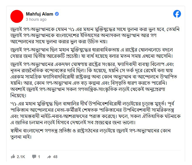 বৃহস্পতিবার (২ এপ্র্রিল) রাতে সামাজিক যোগাযোগমাধ্যম ফেসবুকে দেওয়া এক পোস্টে তিনি লিখেন, জুলাই গণ-অভ্যুত্থান যেমন মুক্তিযুদ্ধের সঙ্গে তুলনা করা ভুল, তেমনি এটিকে দেশের অন্য অভ্যুত্থান বা গণআন্দোলনের সঙ্গে একইভাবে দেখা ঠিক নয়।