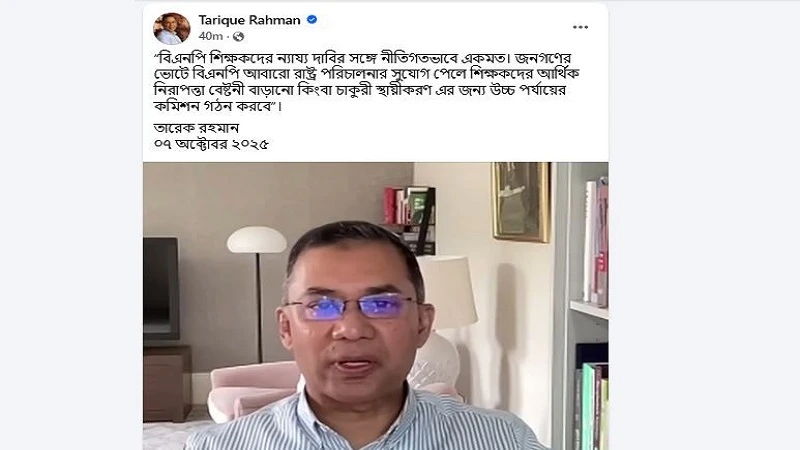 বিএনপি শিক্ষকদের ন্যায্য দাবির সঙ্গে নীতিগতভাবে অবশ্যই একমত বলে জানিয়েছেন বিএনপির ভারপ্রাপ্ত চেয়ারম্যান তারেক রহমান। একই সঙ্গে জনগণের ভোটে বিএনপি আবারও রাষ্ট্র পরিচালনার সুযোগ পেলে শিক্ষকদের আর্থিক নিরাপত্তা বেষ্টনী বাড়ানো কিংবা চাকরি স্থায়ীকরণের জন্য উচ্চ পর্যায়ের কমিশন গঠন করবে বলেও জানান তিনি।
