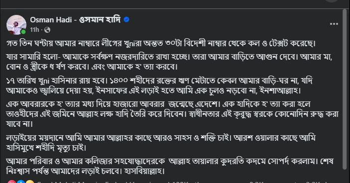 পোস্টে ওসমান হাদি লিখেন, ‘গত তিন ঘণ্টায় আমার নম্বরে আওয়ামী লীগের খুনিরা অন্তত ৩০টা বিদেশি নম্বর থেকে কল ও টেক্সট করেছে। যার সামারি হলো- আমাকে সর্বক্ষণ নজরদারিতে রাখা হচ্ছে। তারা আমার বাড়িতে আগুন দেবে। আমার মা, বোন ও স্ত্রীকে ধর্ষণ করবে এবং আমাকে হত্যা করবে।’