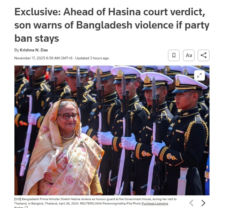 রয়টার্সের প্রতিবেদন: ক্ষমতাচ্যুত সাবেক প্রধানমন্ত্রী শেখ হাসিনার বিরুদ্ধে মানবতাবিরোধী অপরাধের মামলার রায় ঘোষণার আগে তার ছেলে সজীব ওয়াজেদ জয় সতর্ক করে বলেছেন, আওয়ামী লীগের ওপর নিষেধাজ্ঞা বহাল থাকলে দলীয় নেতাকর্মীরা ফেব্রুয়ারির জাতীয় নির্বাচন ঠেকিয়ে দেবে। তিনি দাবি করেন, তার মায়ের বিরুদ্ধে হওয়া মামলার রায় রাজনৈতিকভাবে প্রভাবিত। তিনি হুঁশিয়ারি দিয়ে বলেন, পরিস্থিতি সহিংসতায় রূপ নিতে পারে।