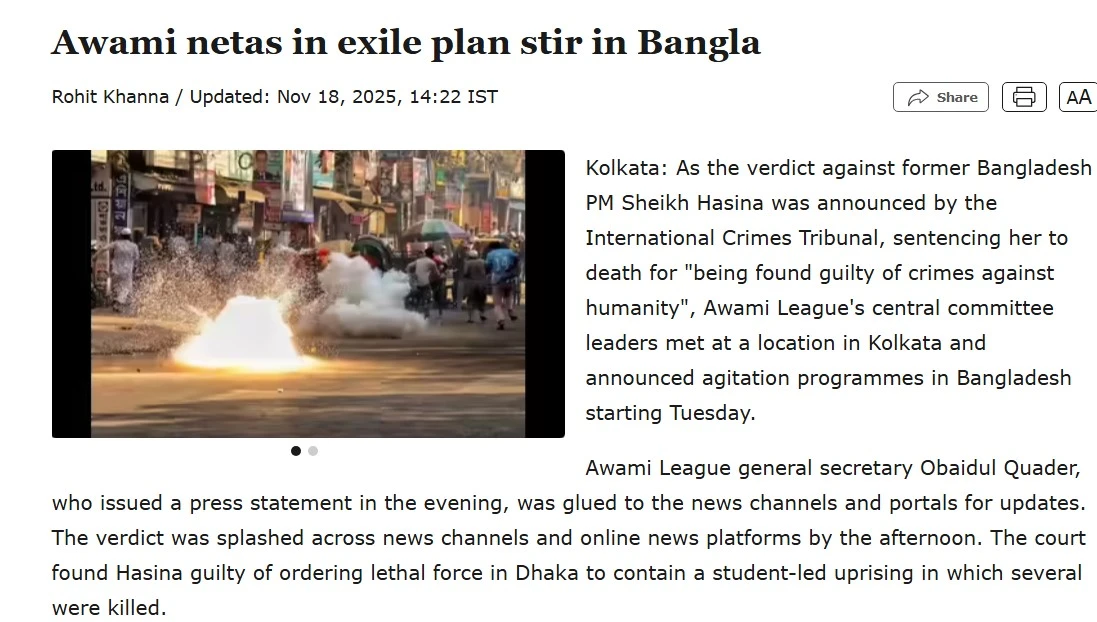 টাইমস অব ইন্ডিয়া: কাযর্ক্রম নিষিদ্ধ আওয়ামী লীগের কেন্দ্রীয় কমিটির নেতারা কলকাতায় বৈঠক করে বাংলাদেশে আন্দোলন কার্যক্রম চালানোর ঘোষণা দিয়েছেন। আন্তর্জাতিক অপরাধ ট্রাইব্যুনাল সাবেক প্রধানমন্ত্রী শেখ হাসিনাকে মানবতাবিরোধী অপরাধের দায়ে মৃত্যুদণ্ড দেওয়ার রায়ের পর কেন্দ্রীয় নেতারা সোমবার কলকাতার একটি স্থানে বৈঠক করেন। তারা মঙ্গলবার থেকে দেশে উত্তেজনা সৃষ্টি ও আন্দোলন শুরু করার পরিকল্পনা করেছেন। ‘আওয়ামী নেতাস ইন এক্সাইল প্লান স্টেয়ার ইন বাংলা’ শীর্ষক প্রতিবেদনে এ কথা লিখেছে ভারতের প্রভাবশালী পত্রিকা দ্য টাইমস অব ইন্ডিয়া।