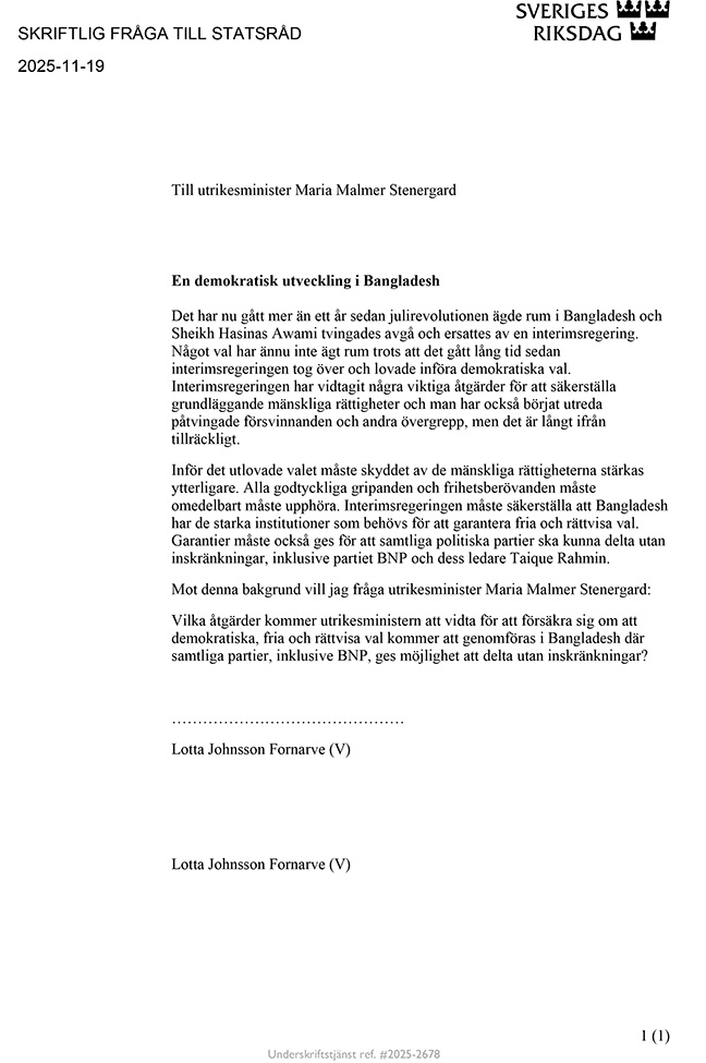বাংলাদেশের নিরপেক্ষ নির্বাচন এবং বিএনপির ভারপ্রাপ্ত চেয়ারম্যান তারেক রহমানের বিষয়ে সুইডিশ সংসদ সদস্য ও পররাষ্ট্রবিষয়ক সংসদীয় কমিটির সদস্য লটটা জনসন ফারনারভে সুইডেনের পররাষ্ট্রমন্ত্রী মারিয়া মালমার স্তেনেয়ারদের কাছে একটি চিঠি লিখেছেন।