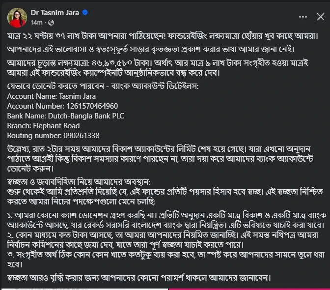 আসন্ন ত্রয়োদশ জাতীয় সংসদ নির্বাচন ঘিরে তহবিল সংগ্রহ করছেন ঢাকা-৯ আসনের সংসদ সদস্য প্রার্থী ও জাতীয় নাগরিক পার্টির (এনসিপি) সিনিয়র যুগ্ম সদস্য সচিব ডা. তাসনিম জারা। মাত্র ২২ ঘণ্টায় ৩৭ লাখ টাকা সহযোগিতা পেয়েছেন তিনি।