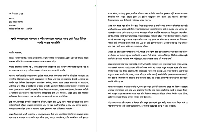 এতে আরও বলা হয়, আমরা সম্মানসহকারে অনুরোধ জানাচ্ছি যে, দলের যে কোনো জোটনীতি নির্ধারণের ক্ষেত্রে এই নীতিগত প্রশ্নগুলো গুরুত্বের সঙ্গে বিবেচনা করা হোক এবং জামায়াতে ইসলামীর সঙ্গে কোনো রাজনৈতিক জোটে না যাওয়ার বিষয়ে স্পষ্ট অবস্থান গ্রহণ করা হোক। আমরা মনে করি, নীতিগত অবস্থানের ভিত্তিতে কৌশল নির্ধারিত হওয়া উচিত, কৌশলগত কারণে নীতিগত অবস্থান বিসর্জন দেয়া উচিত নয়।