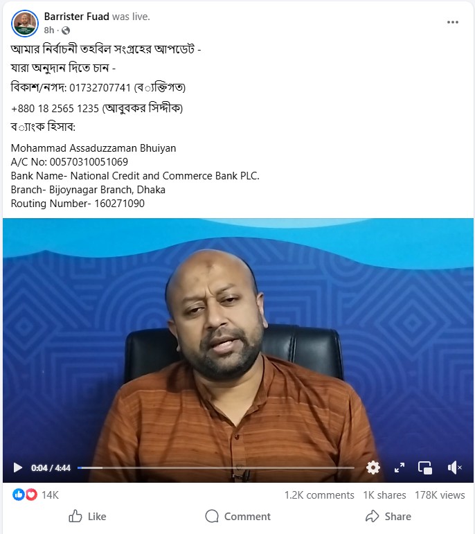 বরিশাল-৩ (বাবুগঞ্জ–মুলাদী) সংসদীয় আসনের প্রার্থী এবং এবি পার্টির সাধারণ সম্পাদক ব্যারিস্টার আসাদুজ্জামান ফুয়াদ নির্বাচনী ব্যয়ের জন্য সামাজিক যোগাযোগমাধ্যমে সহায়তা চেয়ে পোস্ট দেওয়ার পর মাত্র ২৫ ঘণ্টায় প্রায় ২২ লাখ টাকা অনুদান পেয়েছেন।