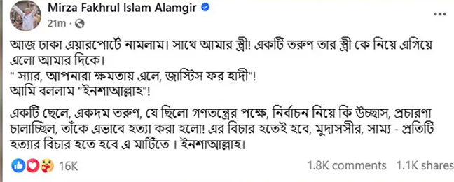 ক্ষমতায় এলে বিএনপি শহীদ শরিফ ওসমান হাদি হত্যার বিচার করবে বলে প্রত্যয় ব্যক্ত করেছেন দলটির মহাসচিব মির্জা ফখরুল ইসলাম আলমগীর।