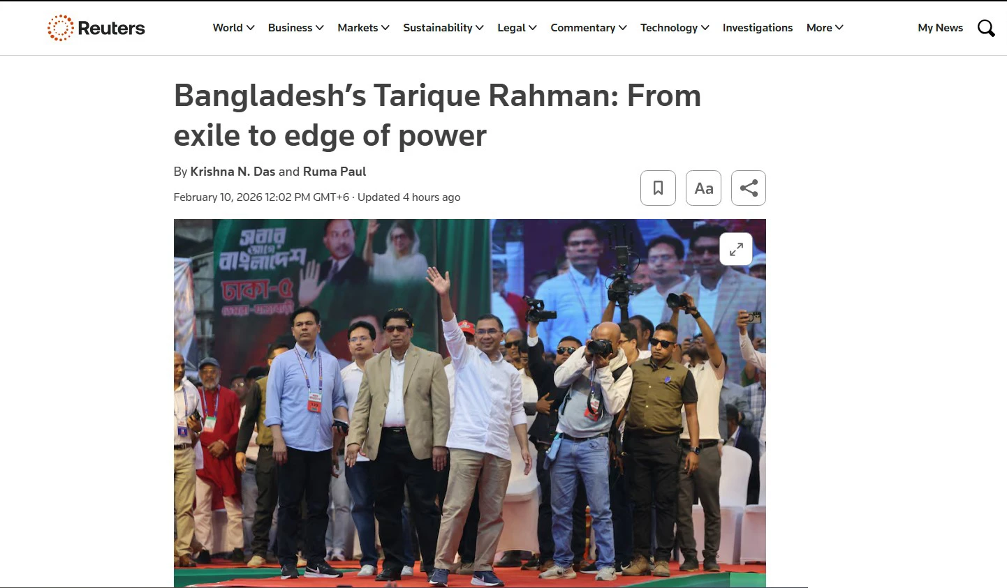 প্রায় দুই দশকের স্বেচ্ছা নির্বাসন শেষে লন্ডন থেকে দেশে ফেরার মাত্র দুই মাসেরও কম সময়ের মধ্যে বাংলাদেশের সবচেয়ে গুরুত্বপূর্ণ নির্বাচনে জয়ী হয়ে তারেক রহমান প্রধানমন্ত্রী হওয়ার দ্বারপ্রান্তে রয়েছেন বলে মনে করা হচ্ছে। জনমত জরিপের পূর্বাভাস সত্যি হলে, আসন্ন বৃহস্পতিবারের নির্বাচন ৬০ বছর বয়সী এই নেতার জীবনে এক অভূতপূর্ব ভাগ্যপরিবর্তনের সাক্ষী হবে। এক প্রতিবেদনে এসব তথ্য তুলে ধরেছে ব্রিটিশ বার্তা সংস্থা রয়টার্স।