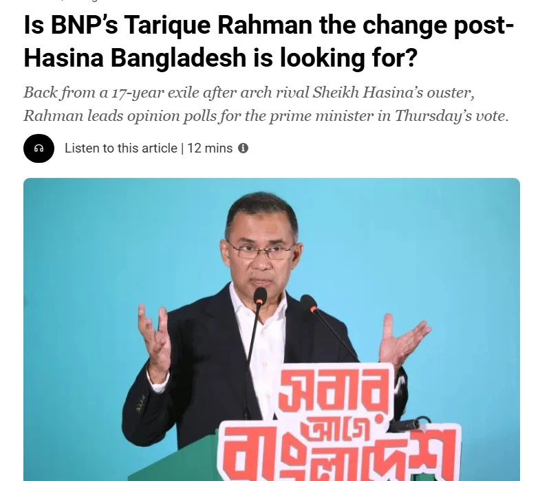 আল জাজিরা বিশ্লেষণ: বিএনপি নেতারা তাদের নির্বাচনী সমাবেশে মানুষের উপস্থিতিকে এমন প্রমাণ হিসেবে দেখছেন যে তাদের দল, ১৫ বছর ধরে হাসিনা শাসনামলে নিপীড়িত থাকার পরও জনগণ তাদের ভুলে যায়নি। তারা এথন নির্বাচনে ক্ষমতায় ফিরে আসার জন্য সমর্থকদের একত্রিত করতে এবং বিএনপির শক্তি পুনর্নির্মাণ করতে সক্ষম হয়েছে। প্রায় ১৭ বছর যুক্তরাজ্যে নির্বাসিত থাকার পর দেশে ফিরে তারেক রহমান বিএনপির নির্বাচনী প্রচারণার কেন্দ্রবিন্দুতে রয়েছেন, তার সমাবেশে বিপুল জনসমাগম ঘটে, তার উপস্থিতি সমর্থকদের আশ্বস্ত করে যে গ্রেপ্তার, অভ্যন্তরীণ বিভাজন এবং হাসিনার সরকারের সময় ভোটারদের থেকে তাদের দূরত্বের পরে দলটি পুনরুজ্জীবিত হচ্ছে।