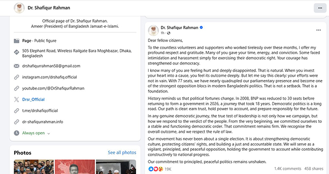 বাংলাদেশ জামায়াতে ইসলামীর আমির ড. শফিকুর রহমান জাতীয় নির্বাচনের ফলাফল মেনে নিয়ে শান্তিপূর্ণ ও দায়িত্বশীল বিরোধী দল হিসেবে কাজ করার ঘোষণা দিয়েছেন।