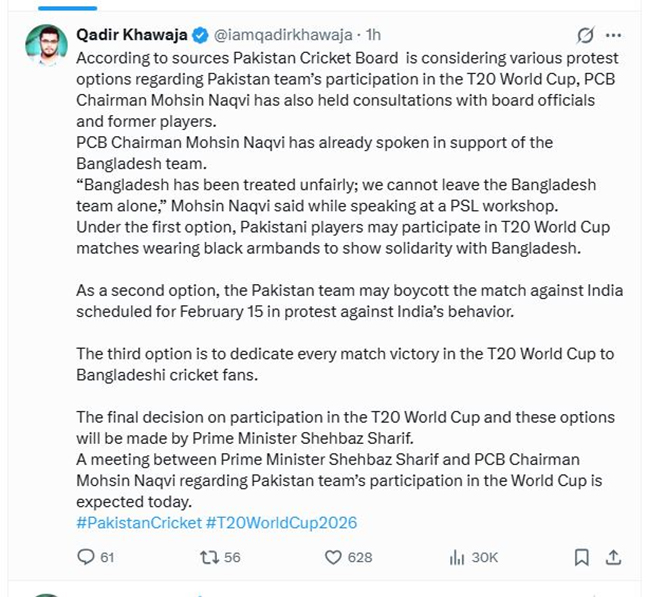 তিনি আরও লেখেন, পাকিস্তানের পক্ষ থেকে ঠিক কী সিদ্ধান্ত আসবে, সেটা শেহবাজ শরিফ ও মহসিন নাকভি মধ্যকার আজকের বৈঠকের পরই জানা যাবে।